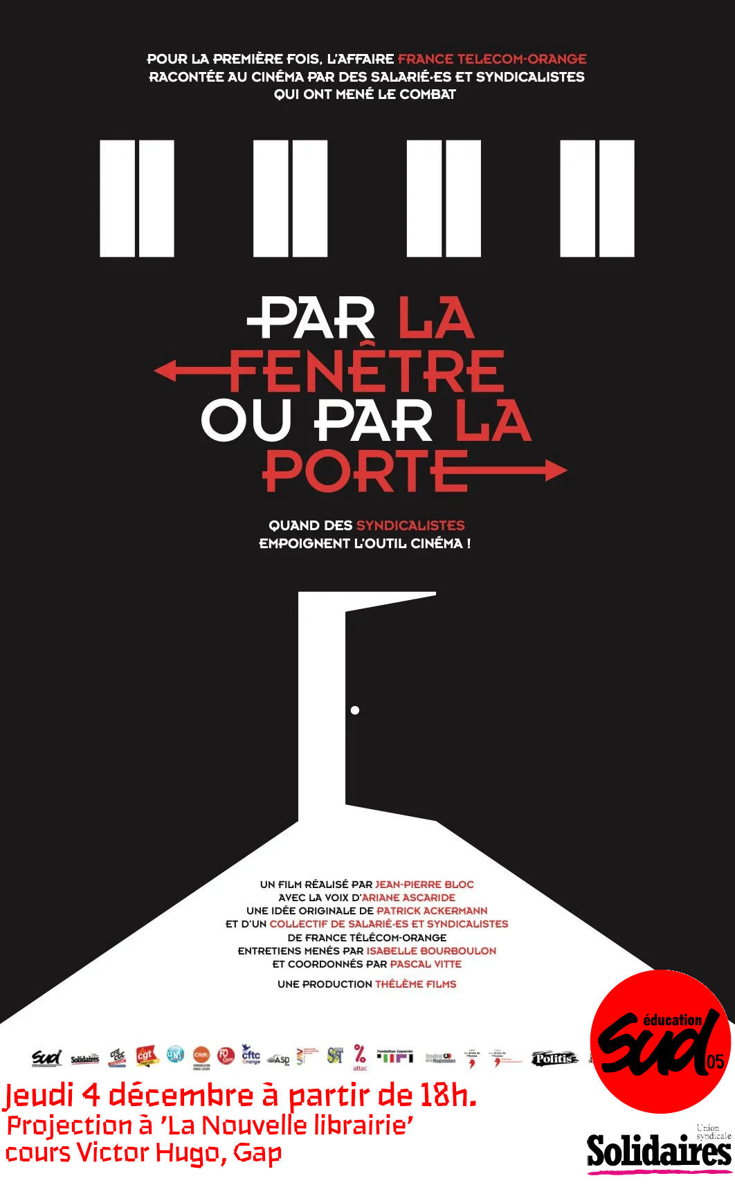 Dans le cadre de la formation « Comment ça va au travail ? », SUD éducation 05 vous invite à la projection du documentaire « Par la fenêtre ou par la porte », à la Nouvelle Librairie 6 cours Victor Hugo, Jeudi 4 décembre 2025 à partir de 18h.
